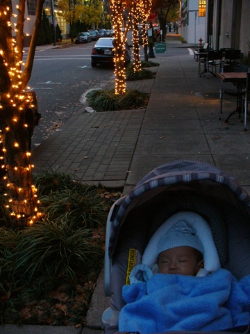 41日目 このところ、昼間はママにスリングで抱っこしてお散歩しています。 でも今日はベビーカーで移動しました。 まちの木にも電飾がキラキラしていてお洒落です。 ここはイタリア料理のお店の横です。 大きくなったらパスタが食べたいな。
