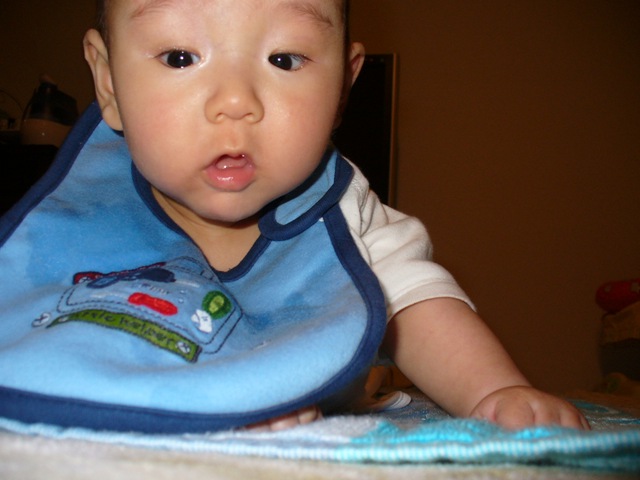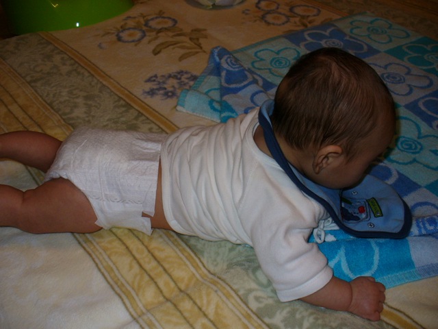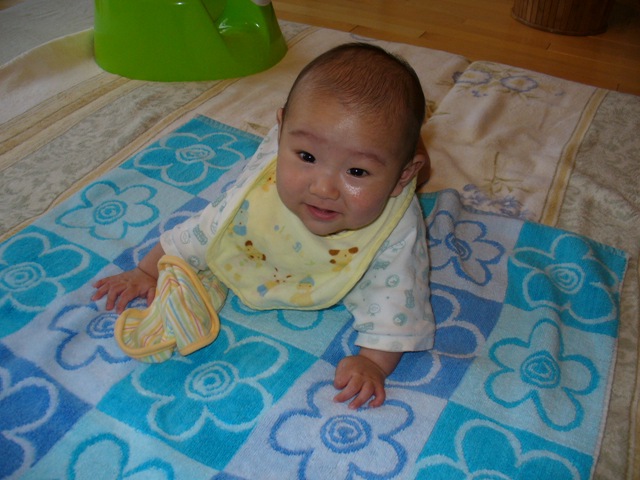 107日目 ごろーん、ごろーんとできるようになってきた。 しかし、これでだけでは移動に困難である、ハイハイを鍛えなくては。 ひじが伸びて胸があがるようになりました。 そうだ、ここで重心を変えれば ずるっと動いた、しかし動く方向が見えないで進むのか、人間はなんて変なつくりなんだ。 只今撤退中