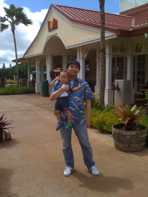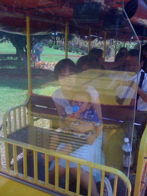 バスの長旅はパパとおそろいのアロハです。 島の北のドールプランテーションまで行きました。 汽車に乗ってパイナップル畑をながめてきました。