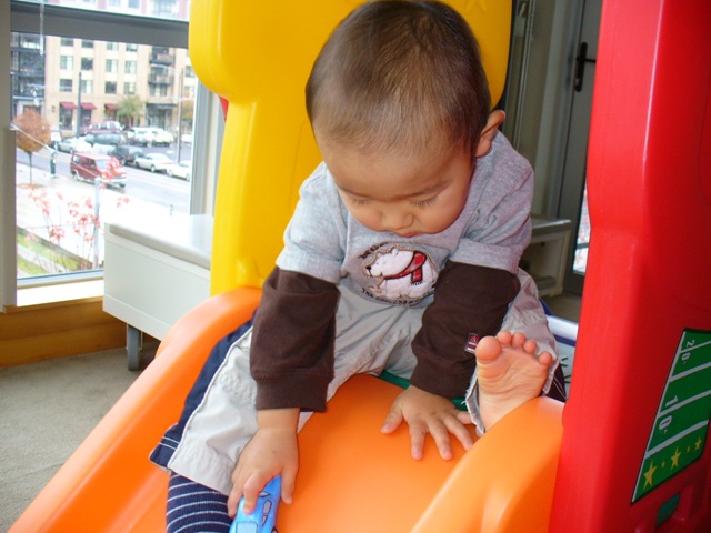 397日目 滑り台からポルシェを投下 サッカーボール、ミニカー、大豆、いろいろ投下 いつか、社長のポルシェも… 今日は編み物会でせいとくんちに集合でした。 できあがるまでまちきれない、そう編み物グッズの方に興味津々です。
