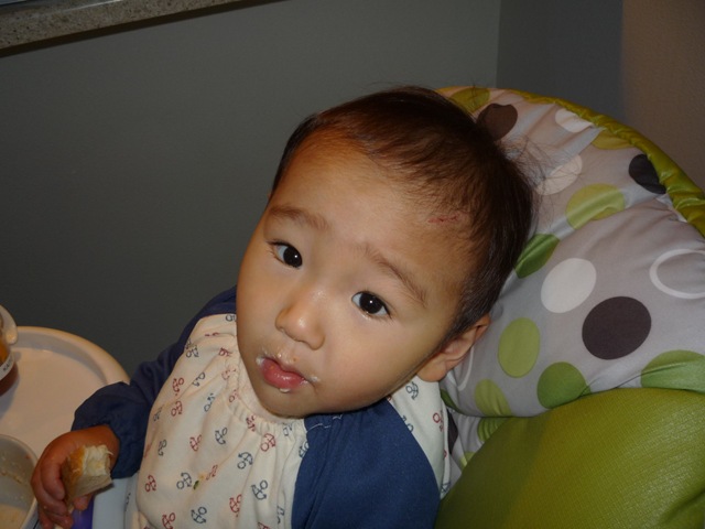 おでこを引き出しの下の角でぶつけました。