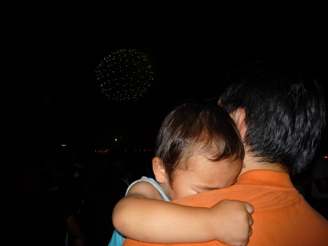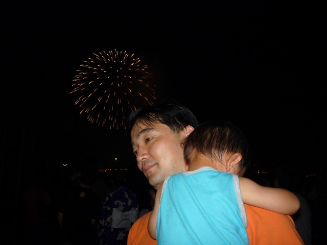さて、夜は花火大会、1時間前まで大雨で、だめもとでいってみたらやってました。