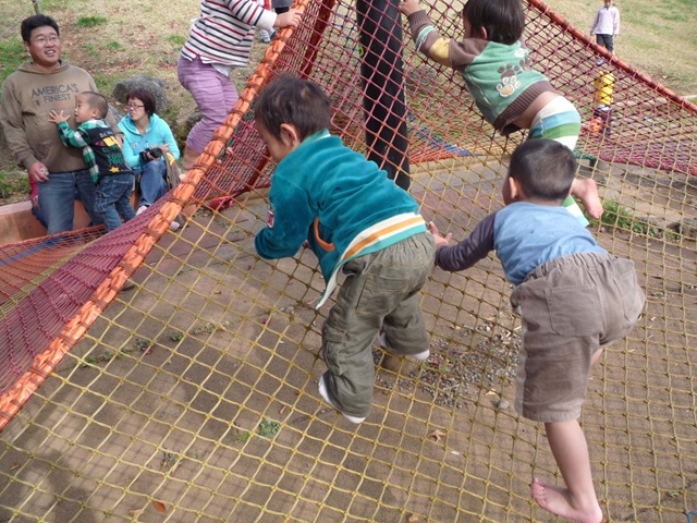 クモの巣ネットではみんなで登って、飛び跳ねる、4歳以上の大きい方に行きたいが我慢