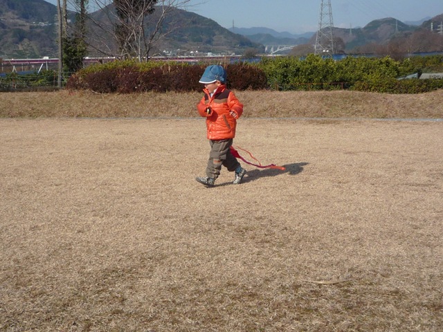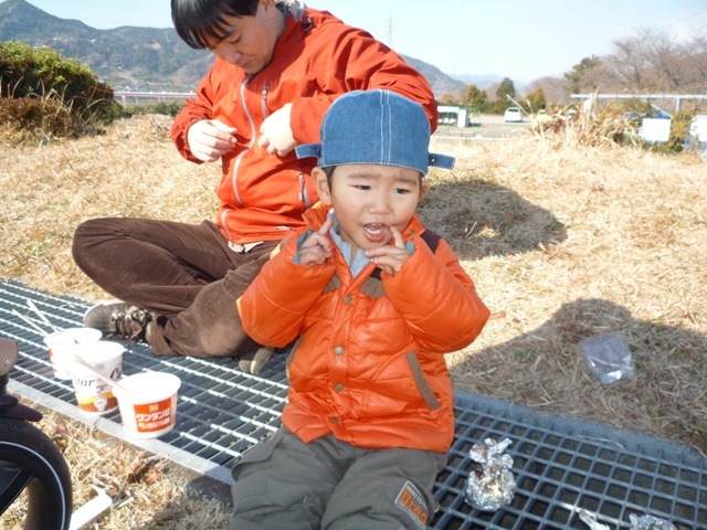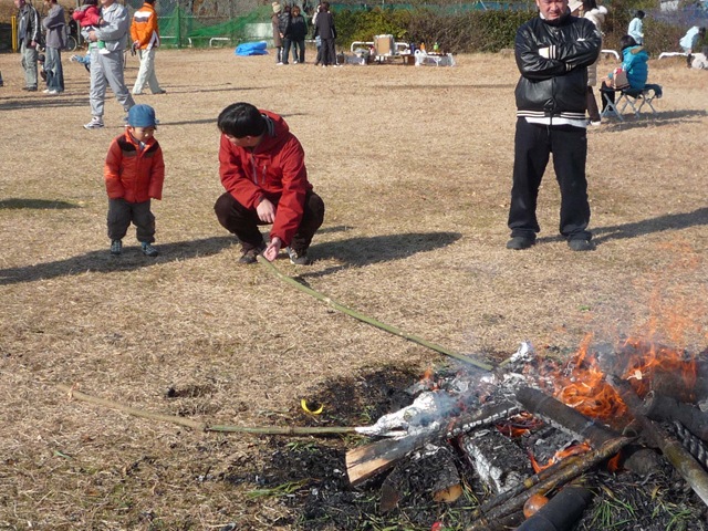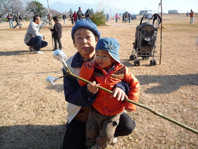 821日目 雁堤でどんど焼きということで行ってみました。 ばぁばが団子をつけた棒を用意、パパは初めて見たようです。 これを火の中にいれて焼きます。 しかし夜は悪夢で泣いたほど火が怖かった。 その後は、隣の凧揚げ大会にエントリー、ゼッケン90番をもらいましたが、足に絡まったりと、あがりませんでした。 お昼に、豚汁とカップめんが配られて、お昼代が浮いてラッキーです。