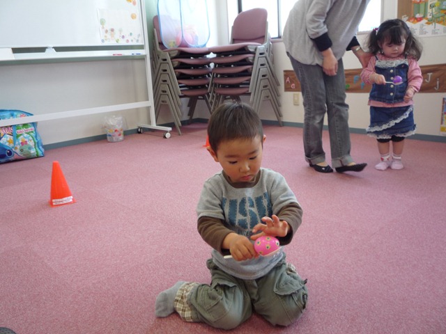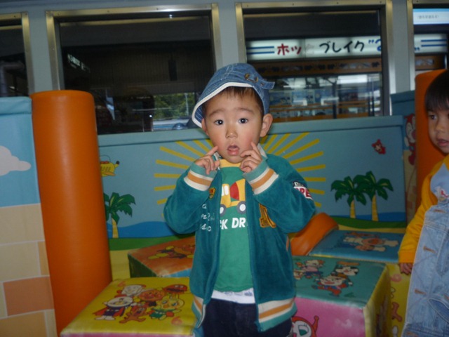 中にはプレイルームが、しかし床の線路の絵の上に別の子がいたせいでご機嫌斜めでした。
